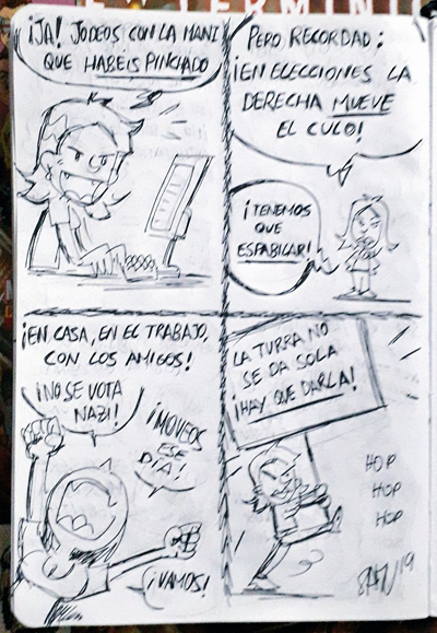 Espero que os guste la imagen de este año, en esta ocasión he prescindido de los pilots, rotus y pinceles pentel con los que hago los dibujos que suelo lanzar en RRSS y he optado por entintar con pincel del 0 y tinta china sobre el boceto a lápiz tal cual en mi libreta (trabajado todo de una sola prescindiendo de mi querida mesa de luz). Disfruto mucho entintando de esta forma y es la técnica con la que realizo todos mis cómics y colaboraciones en proyectos fuera de todo lo que sea lo que considero como 'cómic o dibujo rápido'. El color sigue siendo una sencilla aplicación de color plano con cortes y un degradado en PS.